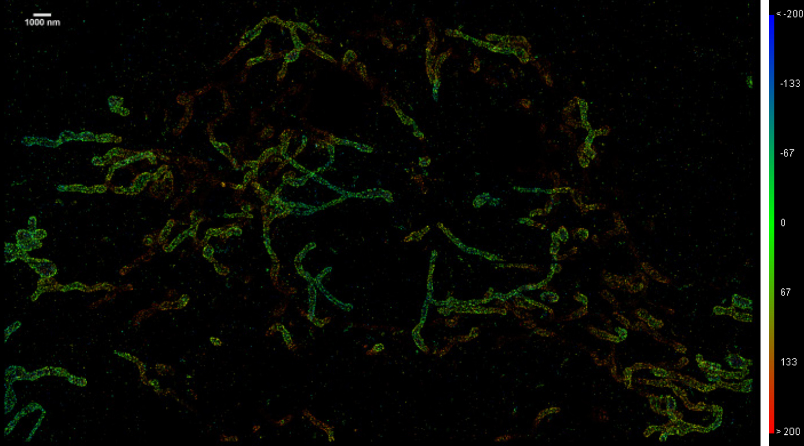 COS-7 細胞中線粒體的三維超高分辨率成像。線粒體外膜蛋 白 Tom20 采用間接免疫熒光標記。外膜蛋白勾勒的線粒體呈中空 結(jié)構(gòu),寬場成像或共聚焦顯微鏡成像難以捕捉如此清晰的結(jié)構(gòu)特 征。z 軸的位置信息用顏色梯度表示。