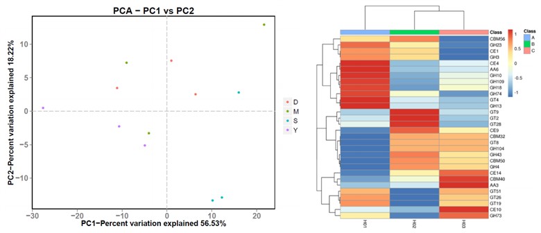 篩選與樣品分組顯著相關(guān)因子(基因、功能);基于篩選因子對(duì)樣品進(jìn)行主成分分析(PCA);基于篩選因子對(duì)樣品進(jìn)行 聚類分析。